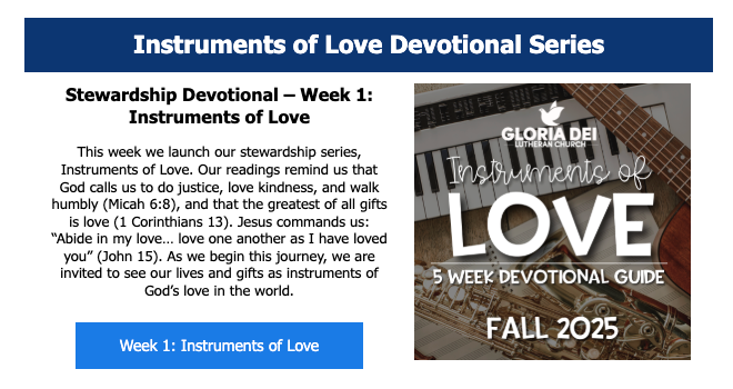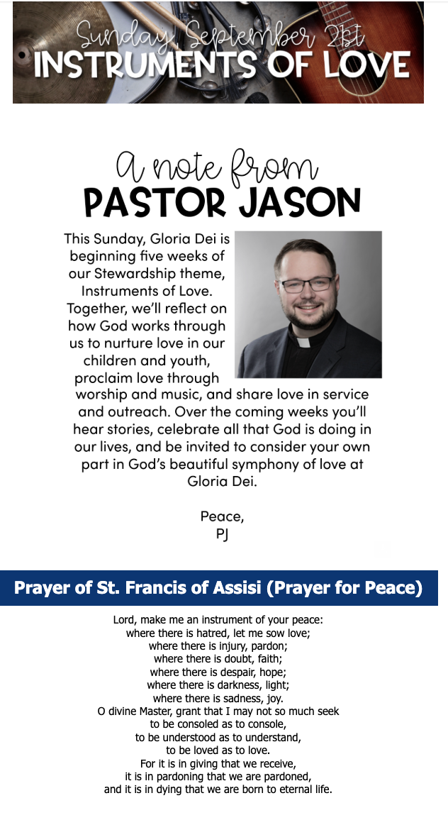 “Instruments of Love” was Gloria Dei Lutheran Church’s 2025 fall stewardship campaign. Rooted in a musical theme, the campaign invited the congregation to nurture, share, and proclaim God’s love through their time, talents, and financial gifts. The theme was developed by the pastor, and I was responsible for translating that vision into a cohesive and engaging communications campaign across all platforms.
